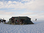 Prontos para montar nossa casa, havíamos lembrado da importante dica de Kevin de carregar uma pedra para auxiliar a montagem da barraca e poder fixá-la bem com todas as cordas. Por ser um deserto, é comum ventar forte, e pela superfície ser extremamente dura, enfiar os pinos no chão não é tarefa fácil sem uma boa pedra. Assim que o sol se foi no longíncuo horizonte monocromático, o frio se apoderou de nossos ossos. Sabíamos que poderia ser tão frio como as noites na região Sudoeste da Bolívia, onde comumente acordávamos pela manhã com o termômetro marcando -17°C. Então nos preparamos para uma noite fria, seca e ventosa. Quando já dormíamos profundamente em plenas nove horas da "madrugada", escutamos um estranho ruído de plástico amassando, pensamos "Ratos por aqui, mas que merda, estão a revirar nossos alforges de novo!". Abrimos o zíper da barraca e percebemos que uma fina chuva, um pouco congelada caía, por isso estavamos passando calor com tanto agasalho dentro do saco de dormir, o clima havia virado e a temperatura havia aumentado um pouco. E como sempre, o André foi quem teve que sair da barraca naquela friaca para cobrir os selins da bicicleta, que se estragam com a chuva. "Que azar", pensávamos," justo no salar vamos pegar chuva? É a maldição da Carretera Austral nos perseguindo?". Em seus sonhos esta noite, Ana se via acordando com a barraca toda cheia de sal encalacrado, as bicicletas cobertas de ferrugem e um sal formando uma crosta seca nas correntes e relação da bicicleta, um pesadelo!