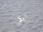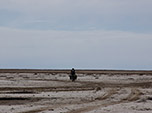 Não encontrávamos nenhuma "pista", apenas algumas marcas suaves de rodas que iam em todas as direções possíveis. Neste dia ainda podíamos ver o Vulcão Tununpa muito ao longe, e alguns veículos minúsculos no horizonte branco, então deduzimos mais ou menos uma rota, e logo percebemos que não perderíamos o rumo graças ao Xixi. Sim, ao xixi! Afinal descobrimos que o salar não é tão branco assim. Como o pessoal que viaja de carro turístico ou de bicicleta não tem moita para se esconder, o jeito é aliviar suas necessidades no meio do deserto branco, a maioria não se dá ao trabalho de se afastar da "pista" principal. Aí fica fácil saber qual o lugar onde mais pessoas passaram, guiando-se pelas manchas amareladas sobre o salar.