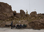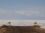 Ao avançarmos começamos a visualizar a Ilha, quanto mais pedalávamos mais firme sua imagem, mas parecia não chegar nunca. Nada mudava ao avançarmos quilômetros senão o tamanho da Ilha e mais dores no corpo devido a trepidação da pista, tudo ao redor era monótonamente branco, mas tínhamos um vento frio a nosso favor e isso era bom! A 3km da Ilha, Ana não conseguia mais pedalar, tomada pelo desânimo, começou a caminhar, seus ombros doíam demais, André gentilmente acompanhou também caminhando neste trecho, não trocávamos palavra, azedos que estávamos. Na Ilha tomamos um lanche observando as poses as vezes hilárias e as vezes patéticas dos turistas que faziam fotos de perspectiva forçada, o que foi suficiente para recuperarmos um pouco o humor. Economizamos o dinheiro de entrada na ilha porque nos restava pouco, e com o pouco que tínhamos teríamos que chegar até Oruro.