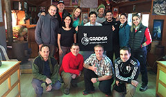 A equipe completa da agência Madison Mountaineering no Acampamento Base do Everest. Rosier Alexandre na ponta esquerda e Andrea Cardona no meio. Foto: Madison Mountaineering